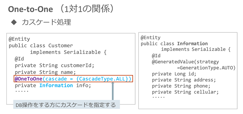 例えば、カスケード指定を「cascadeType.ALL」と書けば、Customerオブジェクトに対するデータ操作(登録、更新、削除など)が、すべてInformationオブジェクトに連動するようになります。