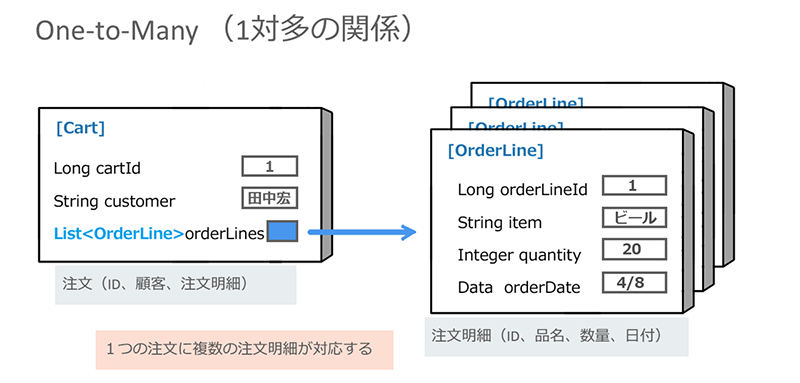 「One-to-Many(1対多)」のマッピングは、例えば1つの「注文(Cart)」に複数の「注文明細(Orderline)」をひも付けるといった場合に使用します。