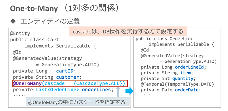 ここでポイントとなるのは、データベース操作を実行するクラス(この例では、クラスCustomer)にカスケード処理を指定することです。カスケードの指定は次のように行います。