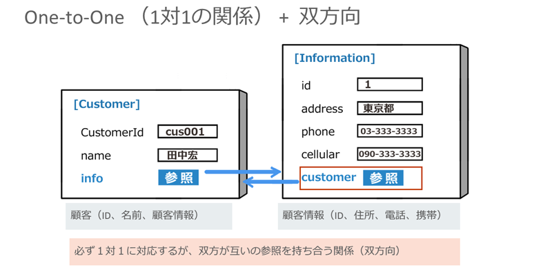 One-to-Oneのマッピングは、2つのオブジェクトが互いに参照し合う双方向型にすることもできます。