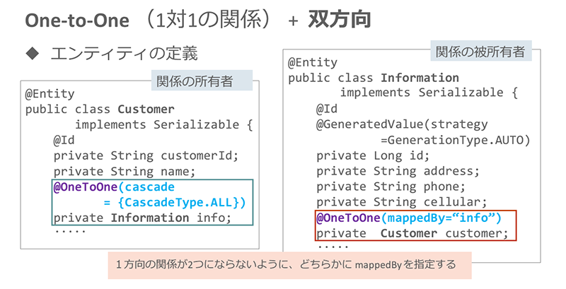 このタイプのエンティティを定義する際のポイントもmappedByの定義をクラスに付与することとなります。ただし、「One-to-One(双方向)」の場合とは異なり、mappedByの指定は必ず「One-to-ManyのMany側」に記述します。指定形式はOne-to-One(双方向)と同じく「OneToOne(mappedBy = …略…)」となります。