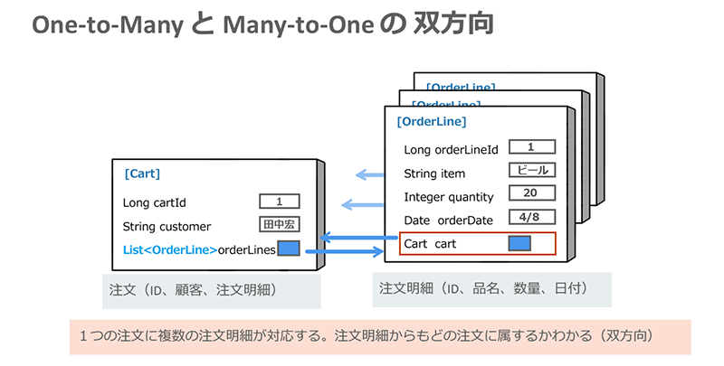 「One-to-Many/Many-to-One(双方向)」の関係を、先ほどの「Cart(注文)」と「Orderline(注文明細)」の関係を例にとって表すと、「1つ1つのOrderlineにCartの情報を持たせ、明細を見れば、どの注文かがわかるようにする」といった具合になります。