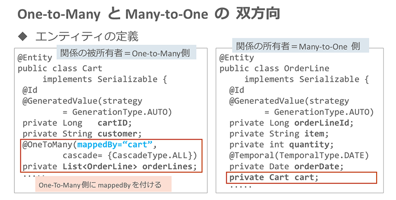 このタイプのエンティティを定義する際のポイントも、One-to-Oneの場合と同様、データベース操作を実行するクラス(Cart)にカスケードを指定する点です。指定の方法は、「@OneToMany(cascade = {…略…})」と「@ManyToOne(cascade = {…略…})」のどちらでもかまいません。