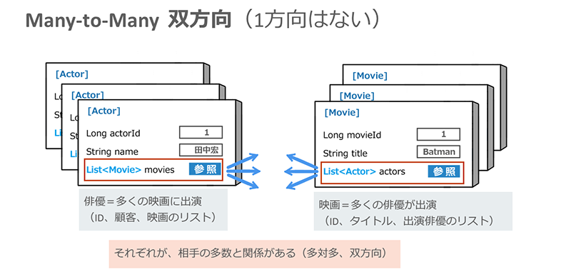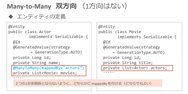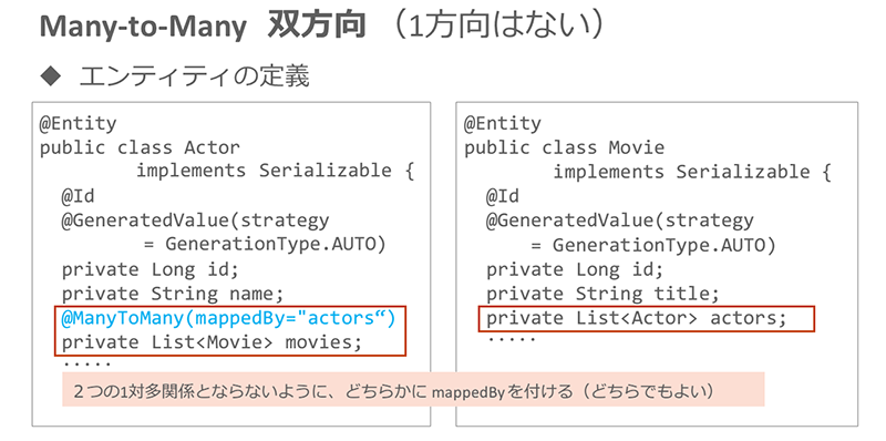 最後の「Many-to-Many(双方向)」とは、エンティティが「多対多」の関係で相互に結ばれるというものです。この関係を使うケースは少ないでしょうが、例えば「俳優(Actor)」と「映画(Movie)」を関連付ける場合などが考えられます。