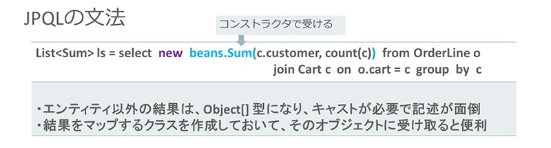 加えて、「SELECT DISTINCT」と「JOIN FETCH」の組み合わせと使うと、例えば「Cartオブジェクトと、それにひも付くOrderLine(複数)を一度に取得する」といったクエリを生成することができます。