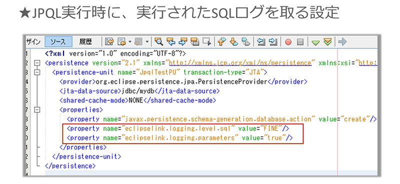 1つ注意点も挙げておきます。JPQLを使う際には、必ずSQLのログを確認することを忘れないでください。その理由は、JPQLからSQLへの変換により、無駄なSQL文が生成される場合があるためです。SQLのログを取るには、JPAの設定ファイルであるpersistence.xmlに次のような設定を記述しておきます。