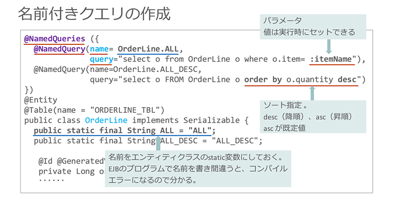 JPQLを使うには、まずエンティティ・クラスにJPQL文を記述します。このとき、プログラム実行時にパラメータの値をセットできるように指定することも可能です。