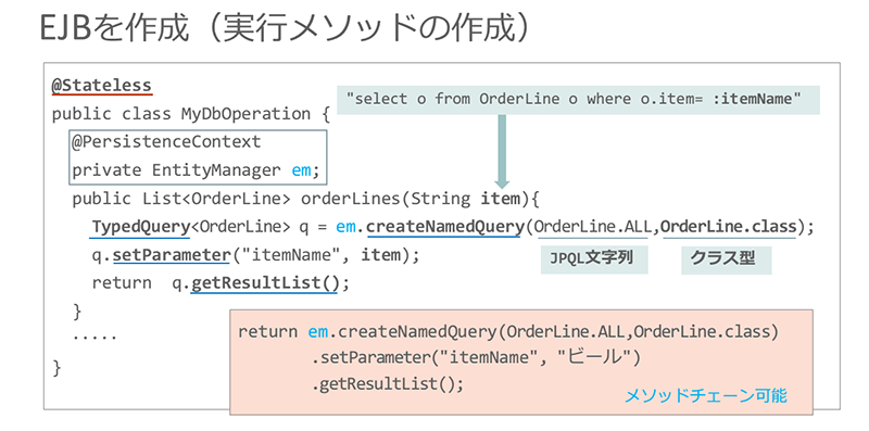 このEJBクラスでエンティティのJPQL文を呼び出してクエリを生成し、パラメータの値をセットするわけです。クエリの実行結果は、getResultListなどのメソッドで受け取ります。