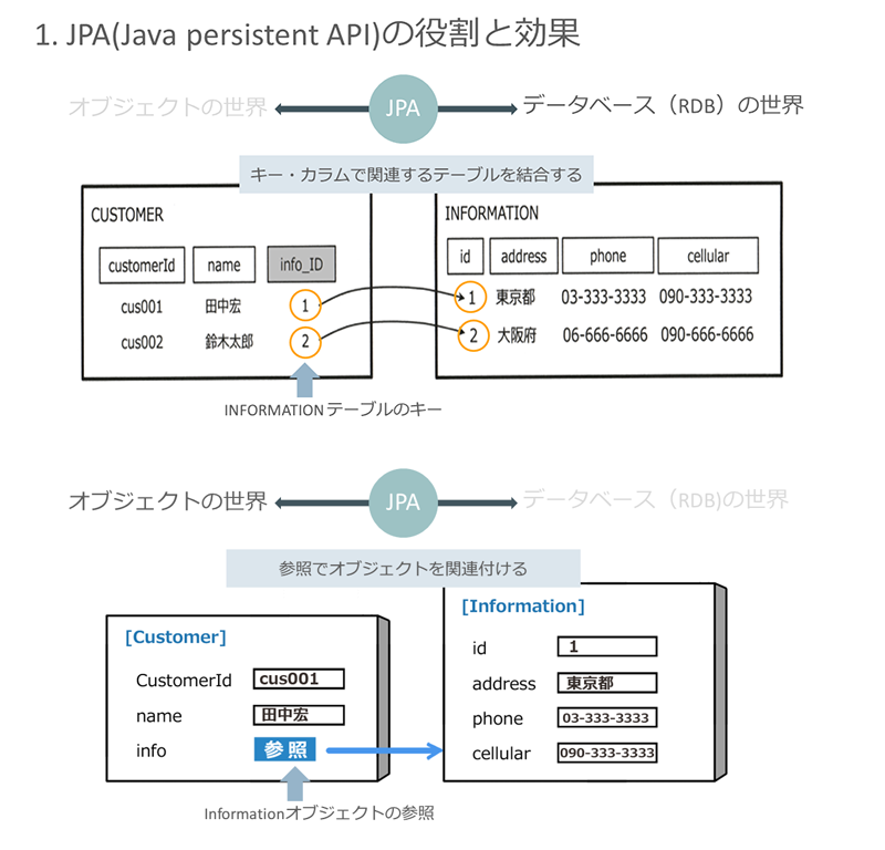 この「参照」と「キー・カラム」による関連付けの間を相互変換することで、JavaオブジェクトとRDBの間の関連付けを行うのがJPAの役割なのです。