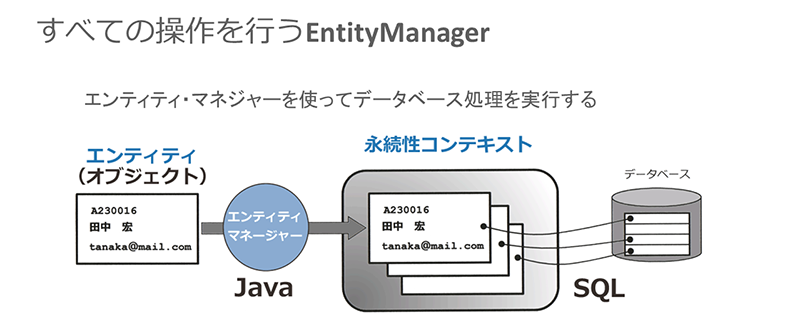 この3つの要素の中でも、中心的な役割を担うのがEntityManagerです。EntityManagerがエンティティを受け取り、さまざまなデータベース処理を一括して実行するのです。