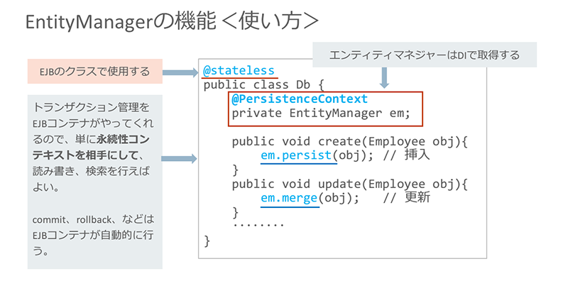 Java EEでは、普通のクラスに@statelessというアノテーションを付けると、そのクラスがEJBコンテナの管理対象となり、データベースとのトランザクション制御などが自動的に行われます。なお、上の図中で下線を引いたメソッドpersist、mergeの引数に指定している「obj」がエンティティ・オブジェクトです。