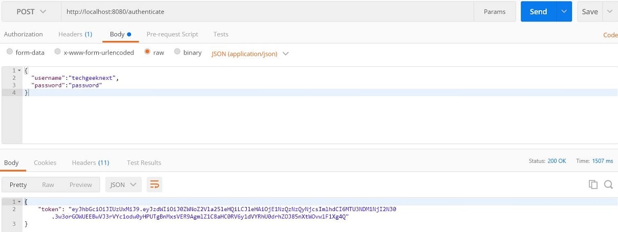 - Generate JSON Web Token (JWT) Create POST request (localhost:8080/authenticate) and provide username and password in request body as given below.