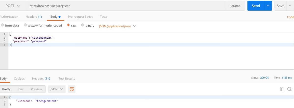 Now finally will test this by using below steps:- Register New User Create POST request (localhost:8080/register) and provide username and password in request body, which will get persist in MYSQL database.