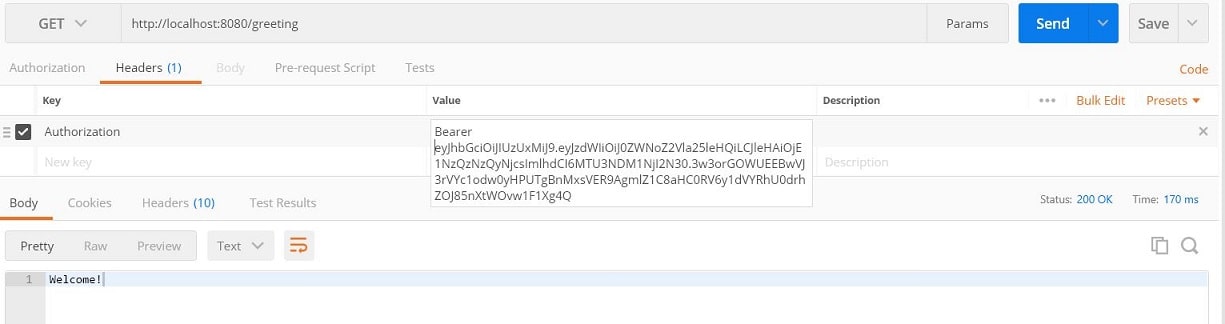 - Validate JSON Web Token (JWT) Now use GET request localhost:8080/greeting with above generated JWT Token in header request.