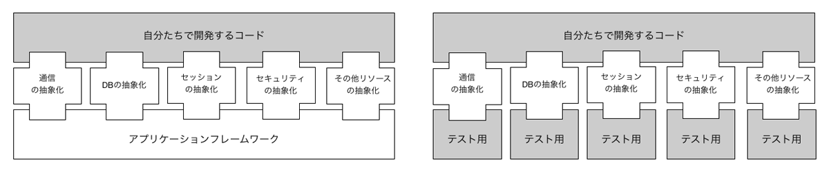 こういった利点は、開発期間を短くするだけでなく、品質の安定性やノウハウの蓄積などにも大きく寄与しています。一方でフレームワークを使う前提の場合、実装されたビジネスロジック部分をテストするときも、フレームワーク上で動作させてチェックしなくてはなりません。