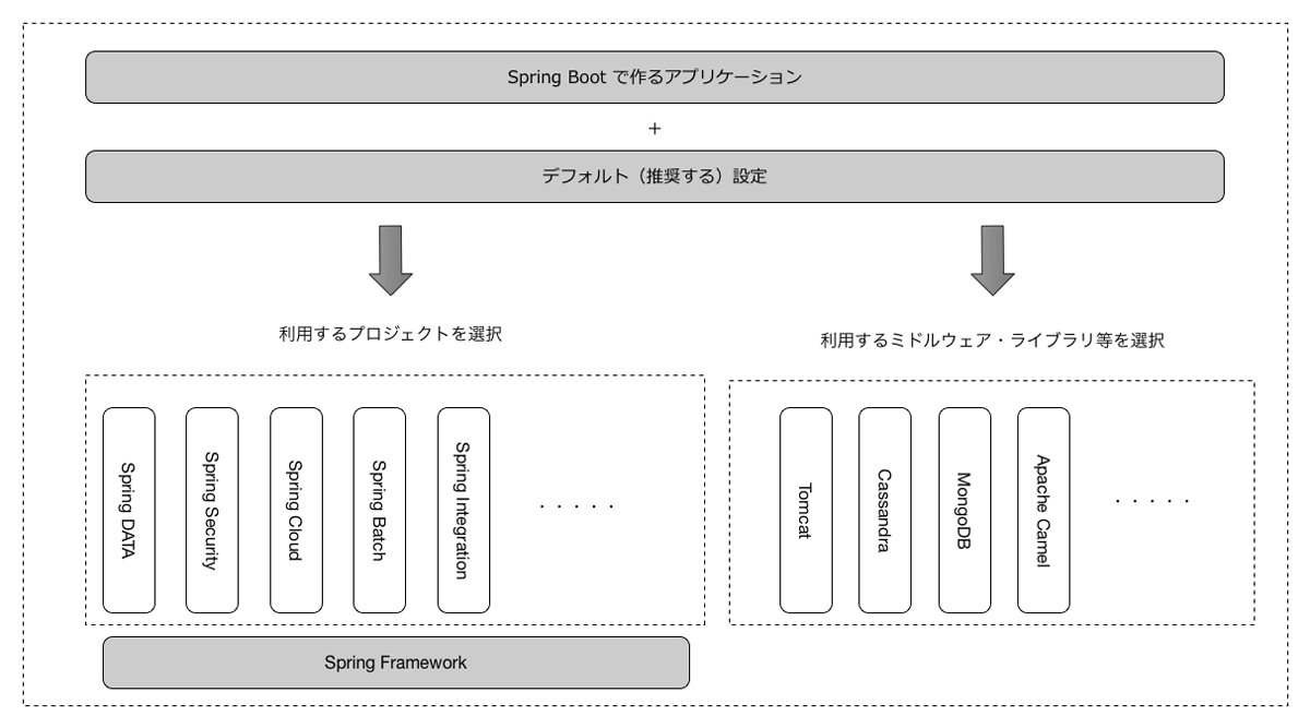 Spring Bootはこういった状況の中で、組み合わせの成功パターンを管理するためのフレームワークと言えます。従って、Spring Bootだけを見ていると全体像がつかみにくいのですが、Spring Frameworkの特徴やこれまでの課題点が分かると、Spring Bootがより理解しやすくなると思います。