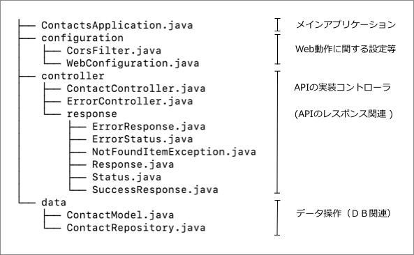 ソースコードは図2に示すように大きくわけて4つのグループで構成されていますが、処理のメインなるAPI部分の実装は、ContactControllerのみとなっています。