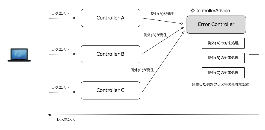 コントローラ内でエラーが発生したときには、それらのエラーに応じたレスポンスの定義をする場合が一般的です。従って、各個別の実装でエラーが起きても共通したエラー処理を記述したくなります。