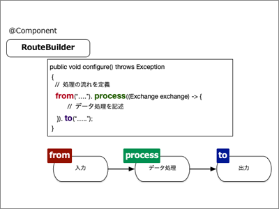 import org.apache.camel.builder.RouteBuilder; : (省略) @Component public class ZipcodeImportRouteBuilder extends RouteBuilder { // (1) 定義を宣言する設定 @Override public void configure() throws Exception { // (2) 処理ルートを定義する from("file://" + file.getAbsolutePath() + File.pathSeparator + "import").process(new Processor() { @Override public void process(Exchange exchange) throws Exception { // ファイルが存在したときの処理を記述 } }).to("direct:import"); // (3) ルートは複数指定できる from("direct:import").process(new Processor() { // (省略) }); } }
