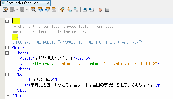 自動的に作成されたImoshochuWelcome.htmlをダブルクリックするとエディタが開きます。titleとbodyを書き換えたものが図2です。