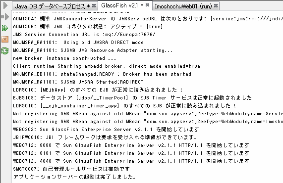 今のところ、A、C、Dを使えれば大丈夫ですが、より生産性を高めるためにはBやEの使い方も習得する必要があります。NetBeans自体の説明が当連載の目的ではないためBやEの使い方は説明しません。単にHTMLを確認するだけであれば、ImoshochuWelcome.htmlファイルを右クリックし[ファイルを実行]をクリックするだけでGlassFishが起動します。起動のログは図4の通りです。応用編で説明予定のJBI(Java Business Integration)というSOAのフレームワークもスタンバイ状態であることが分かります。