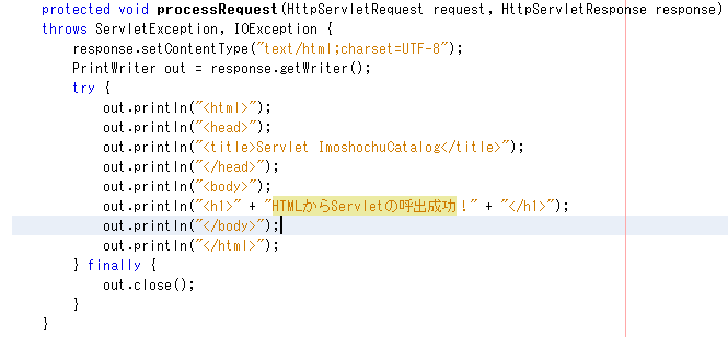 001:protected void processRequest(HttpServletRequest request, 002: HttpServletResponse response) 003:throws ServletException, IOException { 004: // DAOクラスをインスタンス化する 005: ImoshochuCatalogDAO imoshochuCatalogDAO = new ImoshochuCatalogDAOImpl(); 006: // requestからHttpSessionを取り出し、ImoshochuCatalogItemのArrayList 007: // を"imoCatalog"として埋め込む 008: request.getSession().setAttribute("imoCatalog", 009: imoshochuCatalogDAO.getImoshochuCatalogList()); 010: 011: // ImoshochuShop.jspに遷移する 012: RequestDispatcher rd = request.getRequestDispatcher("/ImoshochuShop.jsp"); 013: rd.forward(request, response); 014: 015:}