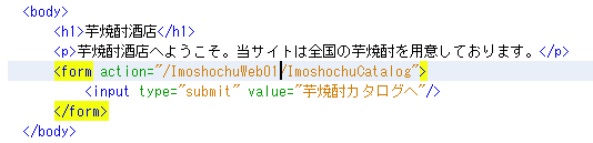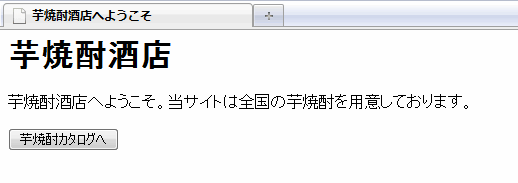 まずは「芋焼酎酒店」のトップ画面を作成します。第7回で認証画面と入れ替える予定です。サーブレットにアクセスするための画面となります。