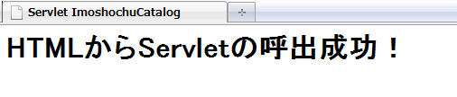 ImoshochuWelcome.htmlからImoshochuCatalogを呼び出すためには、ImoshochuCatalogを図6のように、ImoshochuWelcome.htmlを図7のように書き換えます。両ファイルを保存したのち、HTMLファイルを右クリックし[ファイルを実行]を選択すると図8のように[芋焼酎カタログへ]ボタンが追加されています。このボタンをクリックすると図9の画面が表示され、Servletの呼び出しが成功したことが分かります。