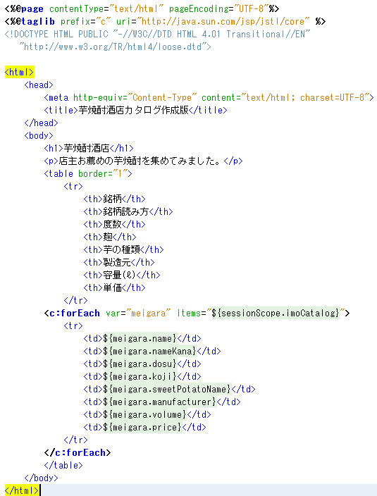 図14が芋焼酎酒店のJSPであるImoshochuShop.jspです。図15がその出力結果です。JSP 1.Xを知っている方はこのシンプルさに感動されるのではないでしょうか。JSLTのc:forEachアクションを使用するだけで、ほぼコーディングが完成してしまいます。JSP 1.XであればsessionのgetAttributeメソッドで"imoCatalog"を指定し、Servletで設定したArrayListを取得し、for文でループを回していました。今回はアクション要素すら使用していません。式言語とJSTLだけを使ってtableを生成することができました。式言語やJSTLの威力を感じていただけたでしょうか?