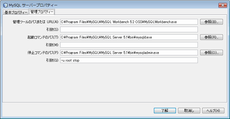 - 停止コマンドのパス:これもMySQL自体の停止コマンドを指定します。上記と同じコマンドではなく、mysqladmin.exe(Windowsの場合)のパスを指定します。