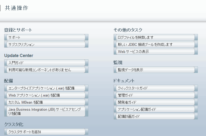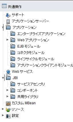 GlassFishの管理コンソールを開くには[サービス]-[サーバー]-[GlassFish v2.1]を選択し右クリックします。[管理コンソールを表示]を選択するとブラウザが開き管理コンソール画面が開きます。メモリが不足しているときは開かない場合があります。使っていないものを閉じてから再度開いてください。図19が管理コンソールの認証画面です。ユーザ名、パスワードは第1回でGlassFishのセットアップで設定したものを入力します。図20は管理コンソールの左ペインです。図21は右ペインです。基本的に左ペインのノードを選択すると右ペインに設定画面が表示されます。ただし、慣れないうちは右ペインに最初に表示される[共通操作]画面から目的の操作を選択することをお薦めします。