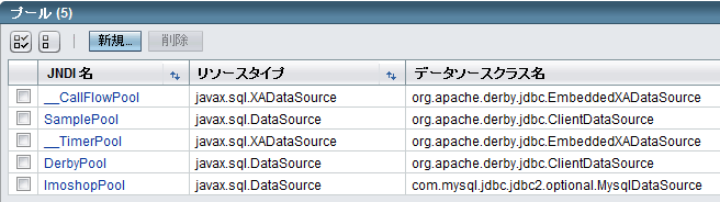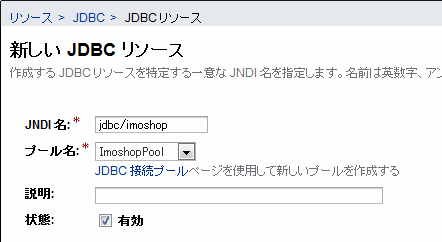 前置きが長くなりましたが、コネクションプールをJNDI名に割り当てます。操作は簡単で[接続プール]のすぐ上にある[JDBCリソース]をクリックします。図28のようにデフォルトのJDBCリソースが表示されます。[新規]をクリックすると図29のように[新しいJDBCリソース]画面が表示されます。JNDI名に「jdbc/imoshop」と入力し、プール名はリストから作成したコネクションプールであるImoshopPoolを選択します。[了解]ボタンをクリックするとコネクションプールとJNDI名が結び付きます。