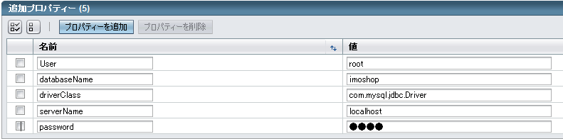 [新しいJDBC接続プール(ステップ 2/2)]画面でデータソースクラス名だけ入力し完了しましたが、実際は一番下にある[プロパティーを追加]ボタンをクリックし、接続に必要なプロパティーを指定する必要があります。ただし、プロパティーの追加はいつでも可能です。図25のコネクションプール一覧から作成したImoshopPoolのリンクをクリックすると図26のように[接続プールを編集]画面が表示され、一番右側の[追加プロパティー]をクリックし、[プロパティーを追加]ボタンをクリックすることでプロパティーの設定ができます。接続に必要なプロパティーは図27の通りです。