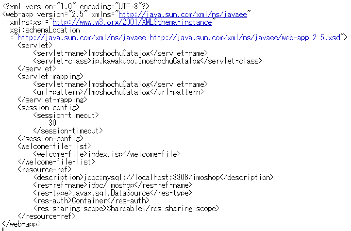 図30がweb.xml、図31がsun-web.xmlです。web.xmlのresource-ref要素の内容がコネクションプールのJDNI名の指定になっています。