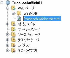 プロジェクトフォルダの[Webページ]アイコンを右クリック して[新規]-[HTML]と選択すると[名前と場所]画面が表示されます。名前に「ImoshochuWelcome」と入力し、場所はWEB-INFとなっていますが、HTMLは静的ファイルであるため、Webページフォルダを指定します。[完了]ボタンをクリックするとプロジェクトフォルダのWebページの下にImoshochuWelcome.htmlファイルが作成されていることが分かります。index.jspは不要なので削除します。図1がこの時点のプロジェクトフォルダの構成になります。