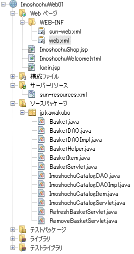 はロールが引数と等しいかを判定し、等しい場合trueを返します。今回の例では、引数が「user」なので、「tomoharu」や「ichiro」はtrueが返り、「jiro」はfalseが返ります。このHttpServletRequestは非常に役立つメソッドを多く持っています。すぐにでもAPIを調べて使えそうなメソッドを確認することをお薦めします。以下は、ログイン画面から呼び出されるImoshochuCatalogServletクラスのprocessRequestメソッドです。