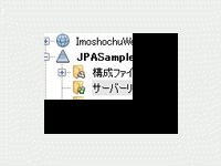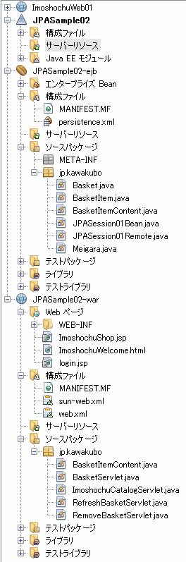 他の項目はそのままで[次へ]ボタンをクリックすると、[サーバーと設定]画面が開きます。デフォルトのままでいいと思いますが、[EJBモジュールを作成]と[Webアプリケーションモジュールを作成]のチェックボックスにチェックが入っていることを確認してください。確認後、[完了]ボタンをクリックすると3つのプロジェクトが作成されます。「JPASample02」「JPASample02-ejb」「JPASample02-war」が作成されていることを、左ペインの[プロジェクト]タブで確認してください。