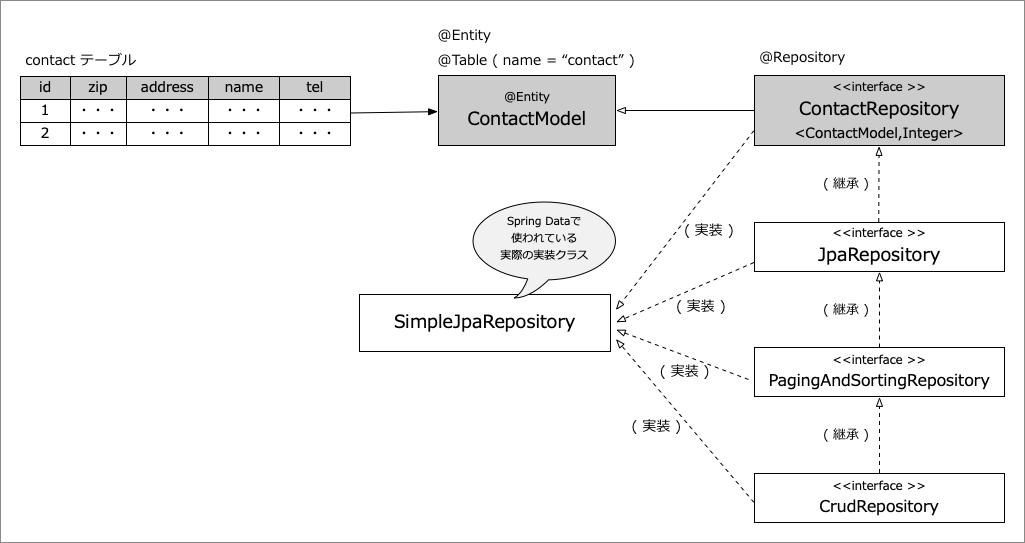 (1)では、このインターフェースがJPAに置けるRepositoryであることを指定します。また、JpaRepositoryを継承する際には(2)のように扱うEntityクラスであるContactModelクラスとそのクラスの主キーの方であるIntegerを指定します。