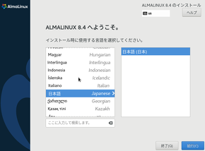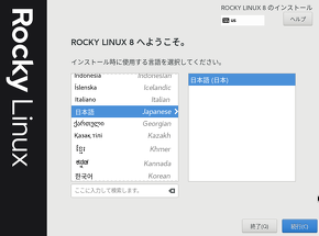 インストール時に使用する言語を選択します。AlmaLinux、Rocky Linuxともに日本語が選択可能です。「日本語」を選択し[続行]をクリックします。