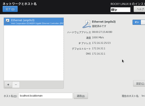 「ネットワークとホスト名」では、イーサネットがオフになっているので、クリックしてオンにします。DHCPでIPアドレスなどの情報が自動取得されます。