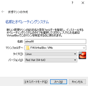 仮想マシンの名前は任意で入力します。タイプは「Linux」、バージョンは「Red Hat(64-bit)」を選択します。