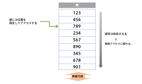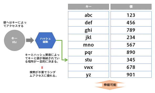 キーによって値が呼び出されるため、順序は意味を持たず、例えば値の追加順を想定した操作は行うことができません。その替わり、キーがあれば対応する値を即座に呼び出せるので、ランダムアクセスに優れています。