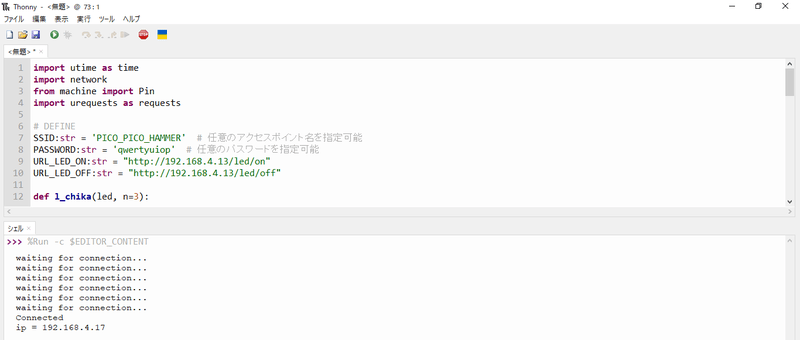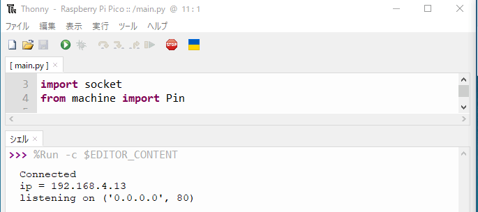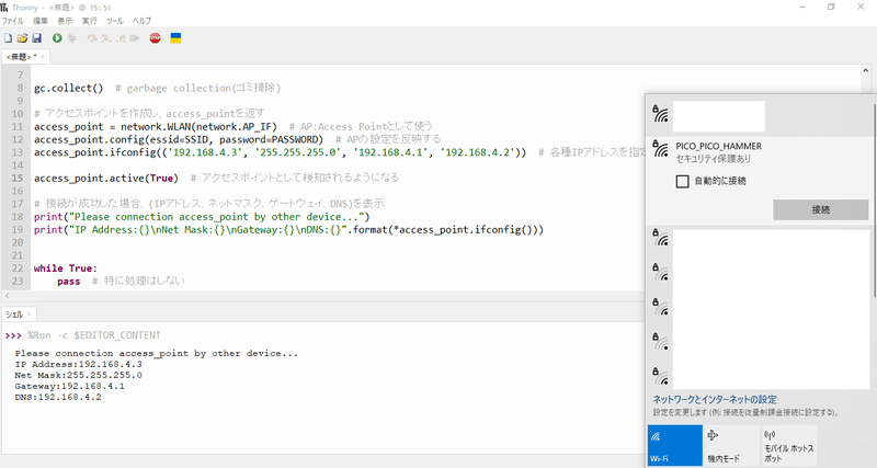 おそらく初回は192.168.4.3になっていて、2回目(Thonnyの実行ボタンを押下して実行)は192.168.4.1になるっぽいです…