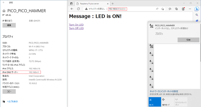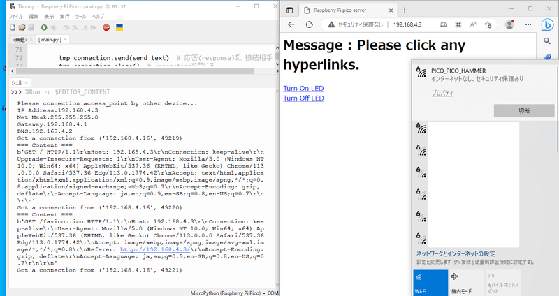 PCやスマホで192.168.4.3にアクセスし、URLをクリックすると、picoのLEDを点灯/消灯 できる。