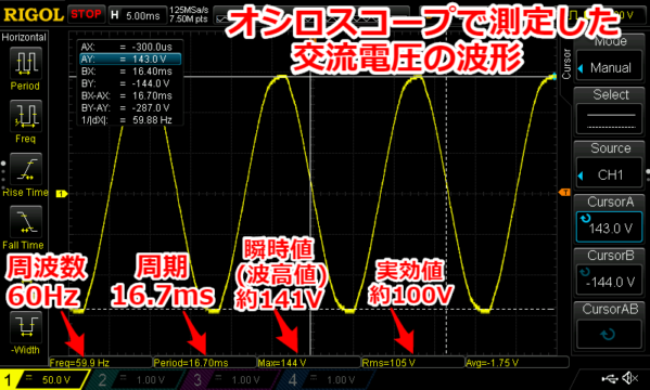 オシロスコープで測定した交流電圧の波形が下記となります。