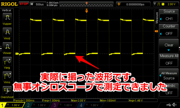 実際に撮った波形が下記になります。無事オシロスコープで測定できました。