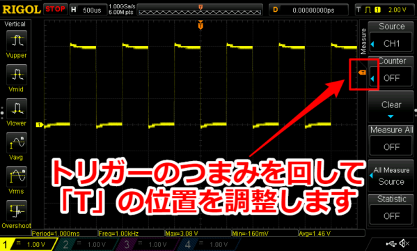 トリガーのつまみを回すと「T」の位置が移動しますので、波形のいる位置に移動させます。