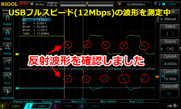 USB2.0のフルスピードとハイスピードの切り替えをオシロスコープで測定しました。