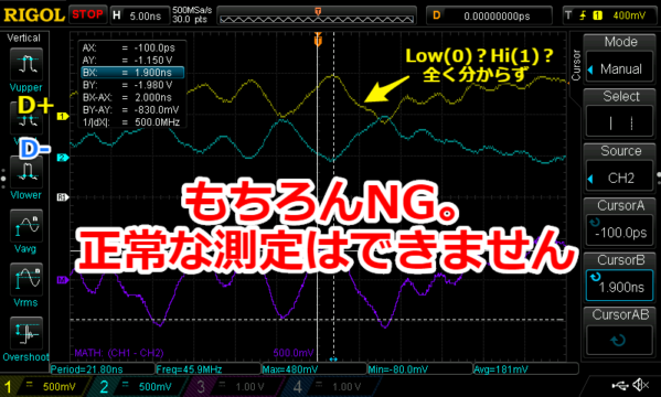 もちろん測定結果はNGです。正常な波形は測定できません。