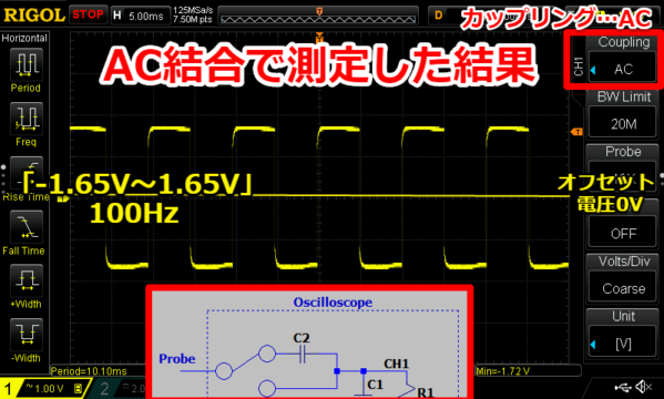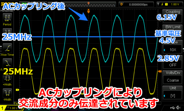 同じ信号をDC結合とAC結合の両方で測定して比較しています。